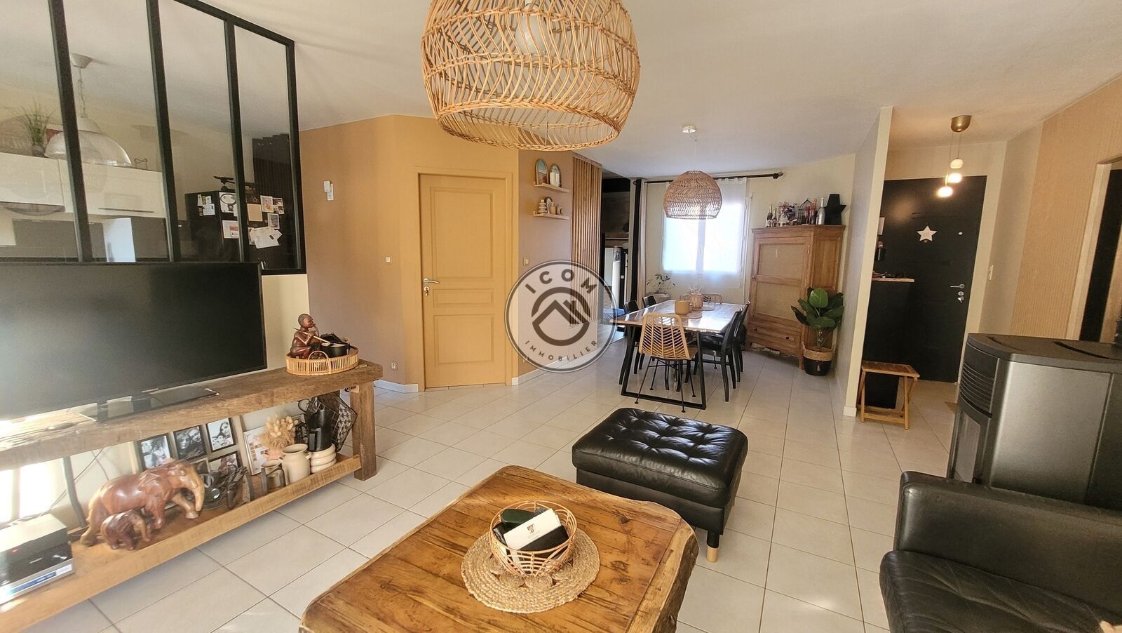 Spacieuse pièce de vie regroupant salon, séjour et cuisine ouverte, offrant un espace convivial et chaleureux, complété par un coin bureau idéal pour le télétravail et d’un